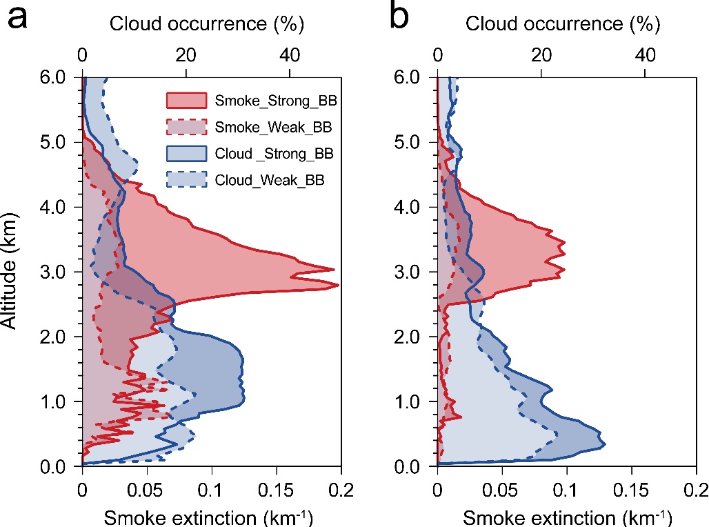 图2 基于CALIPSO卫星垂直探测揭示东南亚大火烟羽与低云增强之间的关联