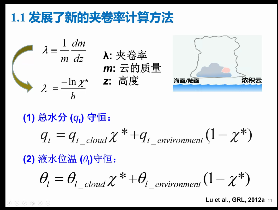 陆教授首先介绍了积云参数化方案的改进。发展了新的夹卷率计算方法,对该新方法进行验证和应用,最终构建了新的夹卷率参数化方案,大幅减小了夹卷率误差。
