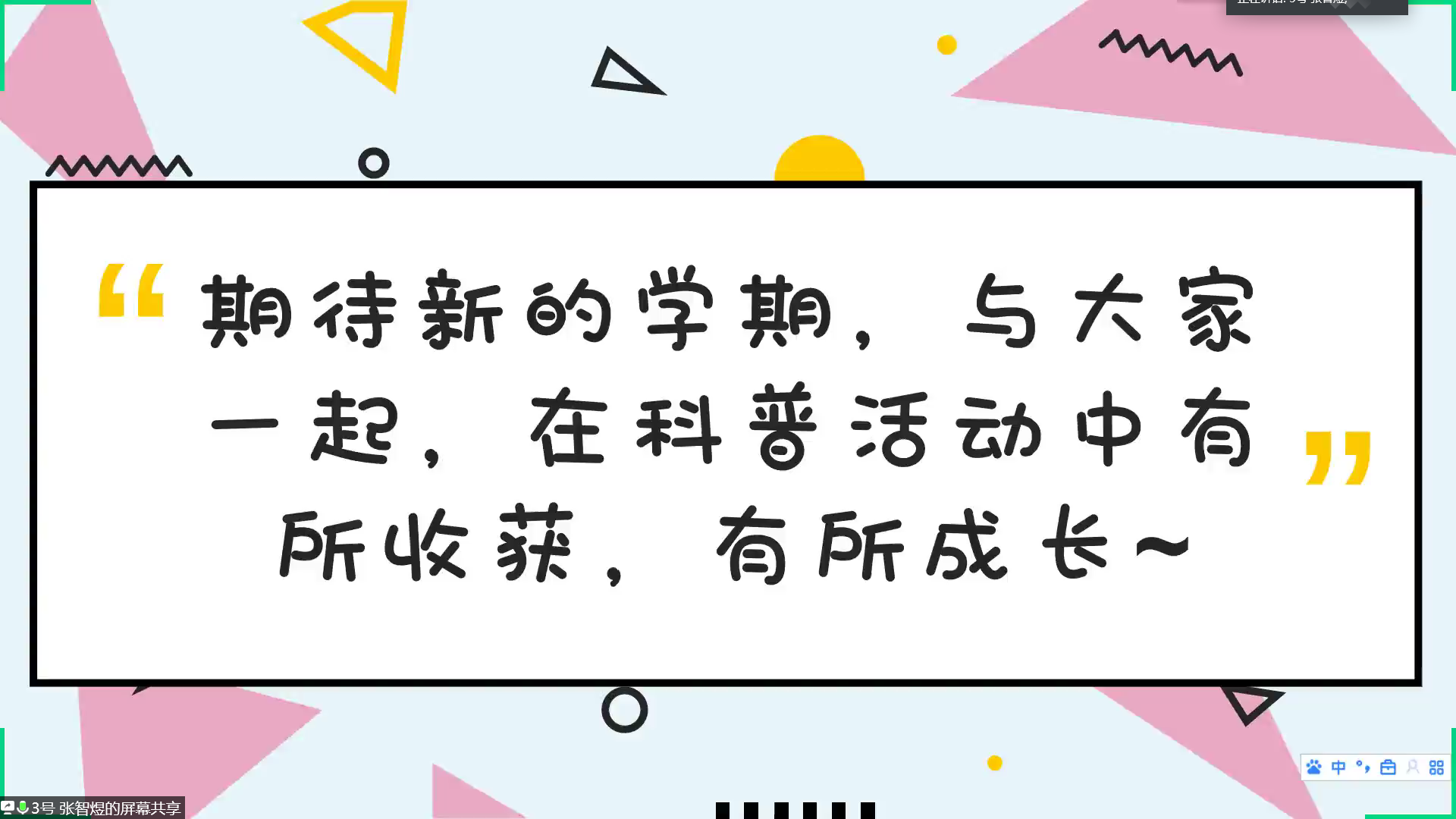 短暂的欢乐时光后,总结会圆满结束,大家虽然彼此相隔,却依旧体会到了为喜爱的事物并肩努力的快乐,讲师团也期待着与大家一起在科普活动中有所收获,共同成长!