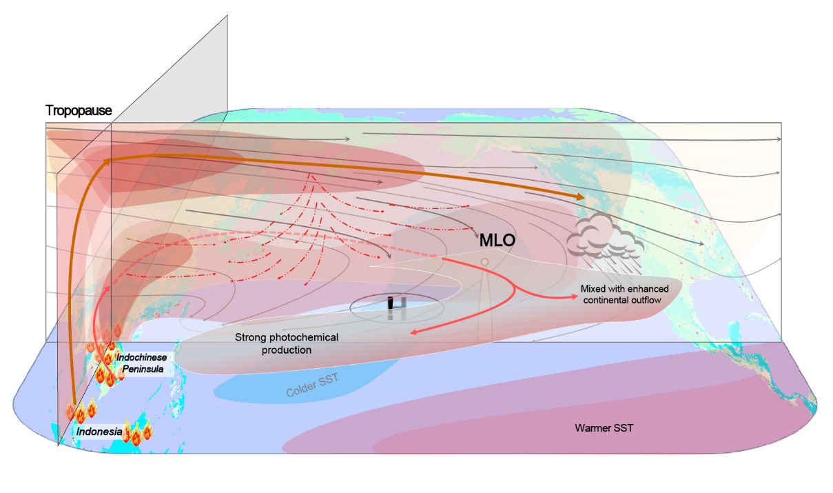 研究发现,中南半岛和印度尼西亚森林大火在厄尔尼诺年的春季明显增强,由此导致臭氧前体物(如一氧化碳和挥发性有机物等)的显著增加与ENSO引起的环流异常可以导致亚热带地区对流层出现长达上万公里的臭氧输送异常。其中,厄尔尼诺影响下东南亚森林大火排放强度自身的年际变化比中国和印度等国人为化石燃料排放在大尺度环流异常情况下的影响更为显著。中南半岛和印度尼西亚地区的森林大火分别在对流层中低层和对流层上层存在两条不同的输送路径;而对流层中低层的输送恰好途径夏威夷Manua Loa全球本底站,并会抵达美国西海岸以及墨西哥等国家。该项研究对以多学科交叉的视角认识地球气候系统的复杂性有重要的科学价值,对于我国环境外交也有积极意义。