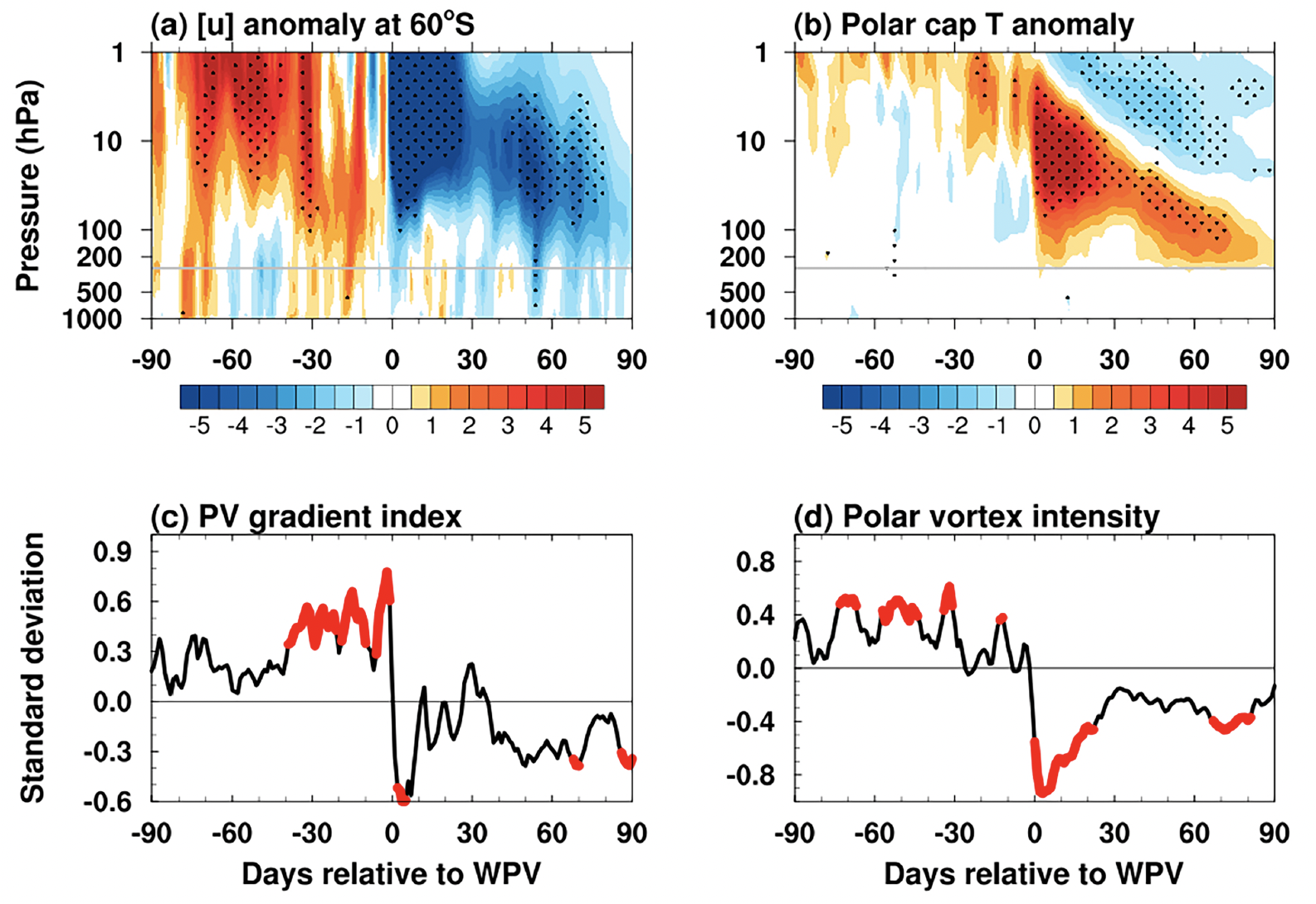 1  WPV事件发生前后(a60°S的纬向风异常、(b)极区平均的温度异常随高度和时间的变化、(c)经向PV梯度指数和(d)极涡强度指数的时间序列。