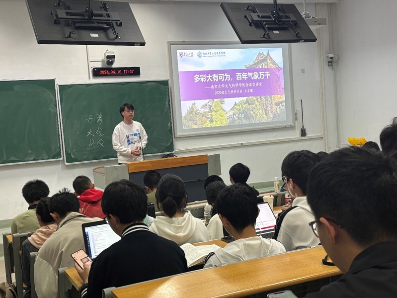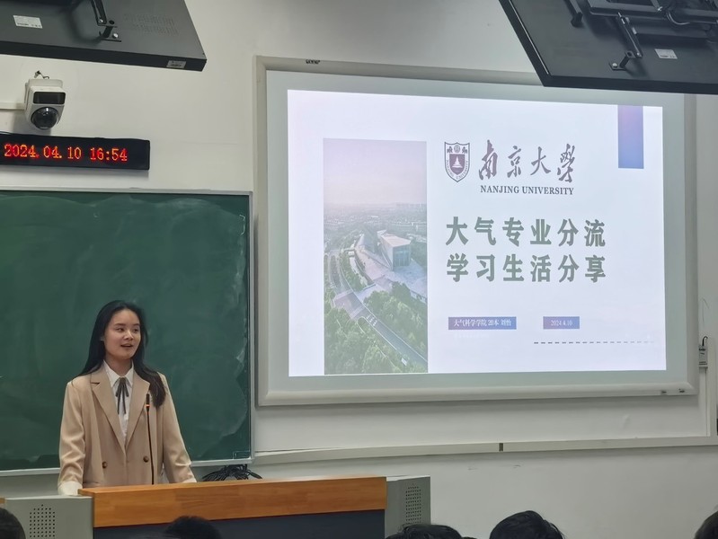 4月10日下午,为帮助2023级本科生更好了解大气科学专业方向与人才培养体系,培养对大气科学学科的兴趣,鼓励广大大一同学选择大气,公司在鼓楼教学楼101教室开展分流宣讲会。公司党委副书记王欢老师、教学副经理黄丹青教授、至诚青年教授汤帅奇、本科教务员陈兵老师及优秀本科生代表刘怡、王若骥参与分享会。分享会由王欢副书记主持。
