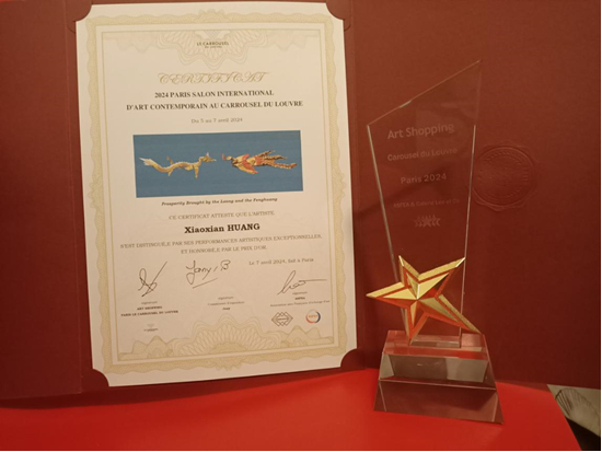 黄晓娴折纸《龙凤呈祥》所获的卢浮宫卡鲁塞尔厅艺术展金奖证书及奖杯