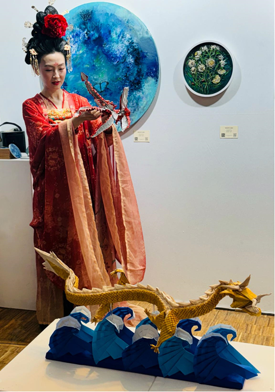 在本次艺术展首日的开幕式上,展会策展人珍妮(Jany)女士向黄晓娴颁发获奖证书和奖杯。黄晓娴以簪花仕女的造型,向现场观众展示由一张双色纸折叠形成三维立体凤凰的整个过程,变幻莫测、巧夺天工,令人叹为观止。现场观众在连连赞叹之余,纷纷与她交流折纸心得、合影留念,其中包括现场表演嘉宾女高音歌唱家亚历山德拉·泰尼舍娃(Alexandra Tenisheva)女士、法国美术家协会主席雷米·艾融(Rémy Aron)先生、画家娜塔莉·米尔(Nathalie Miel)女士等国际著名人士。