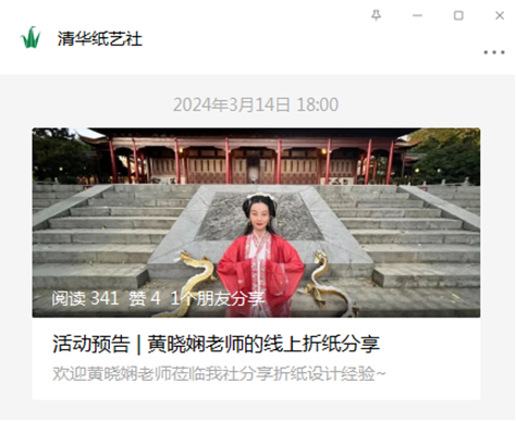 清华大学纸艺社社长何来邀请黄晓娴员工为其社团成员开展折纸设计经验分享线上讲座。为更好地分享折纸艺术经验,黄晓娴不仅介绍了自己设计历程中的点滴心得,还现场动态演示了绘制折序图时会用到的免费矢量绘图软件inkscape的使用方法,最后还为大家深入解读了中国折纸历史文化相关知识。两个半小时的精彩演讲使得前来听课的清华大学、北京大学的青年学子们收获满满;更有北京大学同学兴致盎然、深受启发、学以致用,讲座结束后即设计出平面双色版含“北大”二字的校徽折纸模型。