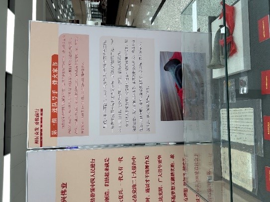展览最后一部分介绍的是入党志愿书里的党员精神。该部分展现了不同历史阶段的革命前辈坚定入党、对党忠诚、为党奋斗的动人事迹。一份份入党志愿书,凝聚了共产党人“坚持真理、坚守理想,践行初心、担当使命,不怕牺牲、英勇斗争,对党忠诚、不负人民”的伟大建党精神。转角处,解放军连队号手旺成使用过的军号吸引了大家的注意力,它静静地躺在展柜里无声地述说着那段艰苦而又伟大的岁月。读着旺成写给母亲的信,瞻仰他获得的解放华北奖章,同学们仿佛身临其境,来到了那个战火纷飞、硝烟弥漫的年代。同学们看到,中国共产党虽然在不同历史时期面临着不同的风险挑战,但始终团结带领中国人民,以“为有牺牲多壮志,敢教日月换新天”的大无畏气概,书写了中华民族几千年历史上最恢宏的史诗。