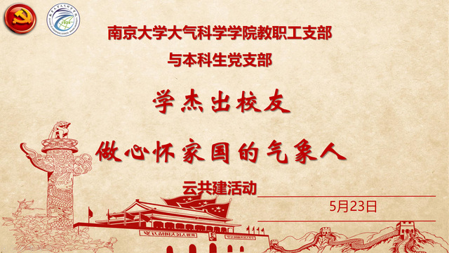 正值毕业生离校之际,为鼓励毕业生在未来的学习工作中不忘初心,砥砺前行。太阳成集团tyc234cc本科生党支部和教职工党支部于6月24日下午开展了主题为“学杰出员工,做心怀家国的气象人”的党支部云共建活动,本次活动由本科生党支部的林浩贤同学主持。