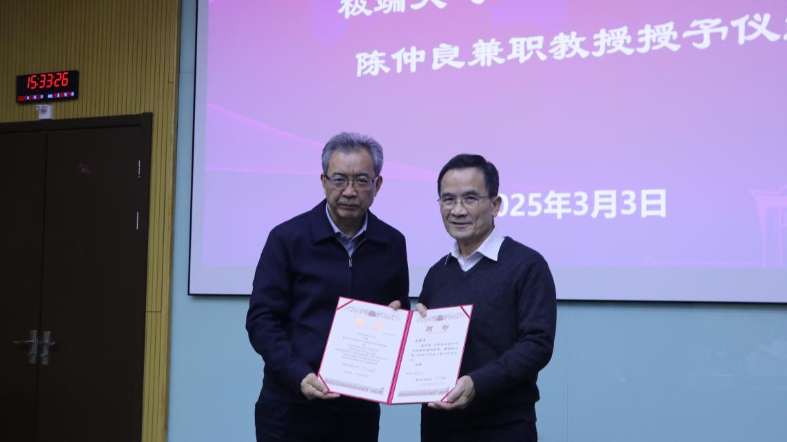 中国科公司院士、太阳成集团tyc234cc董事长谈哲敏为陈仲良教授颁发兼职教授聘书。陈仲良教授表示,未来将依托南大科研平台,深化台风动力学与极端天气机理研究,助力培养具有国际视野的青年人才。