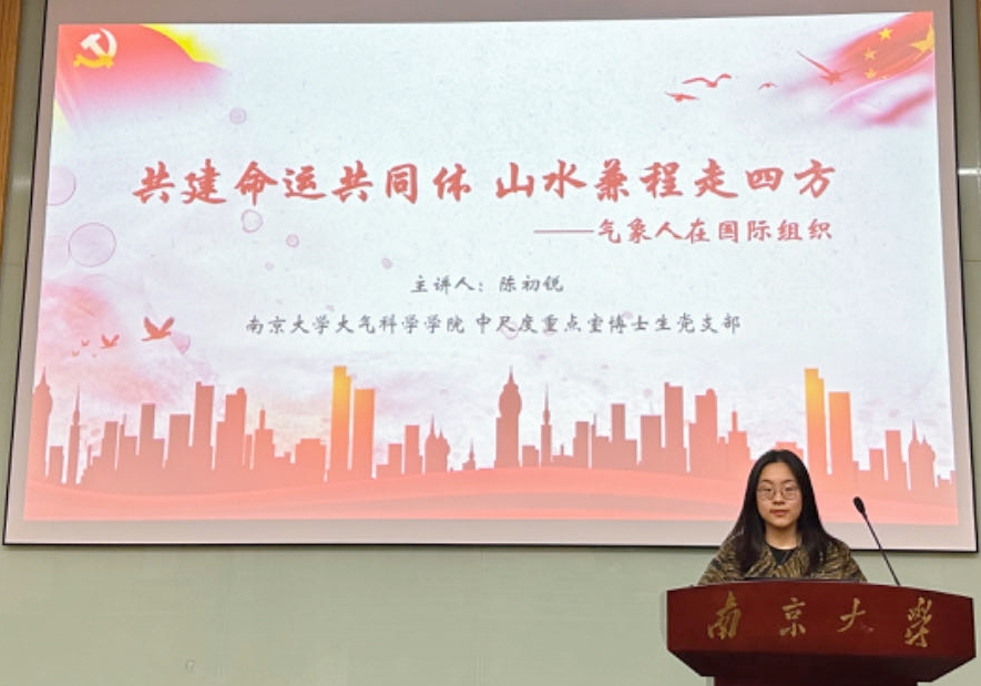 中尺度重点室博士生党支部的陈初锐同学带来微党课《共建命运共同体,山水兼程走四方——气象人在国际组织》,结合她在世界气象组织的实习经历讲述个人成长历程,在实习中不断加深了对推动构建人类命运共同体重大意义的理解,号召青年气象学子勇担时代重任,在世界舞台上展现南大学子的青春风采。