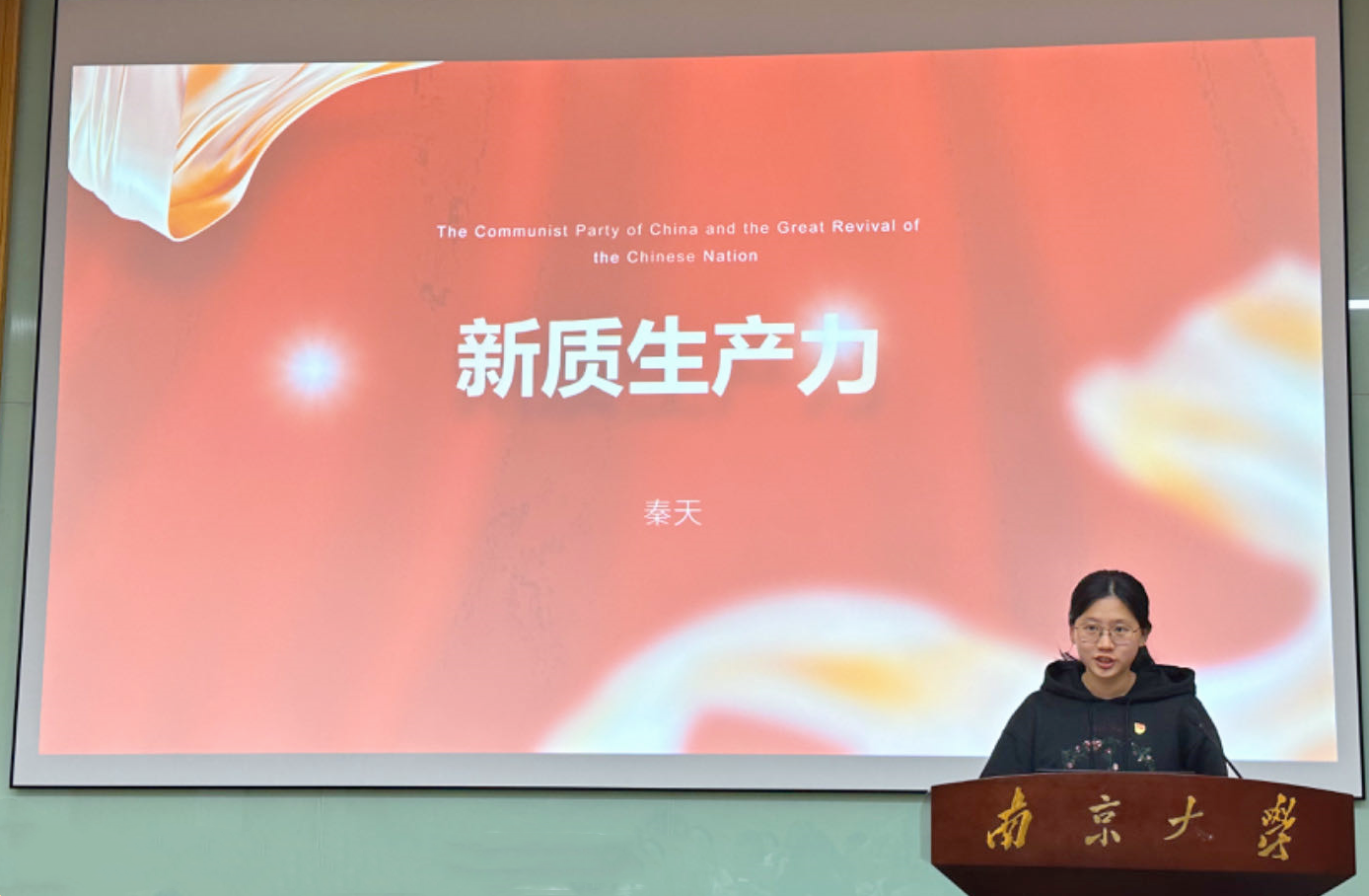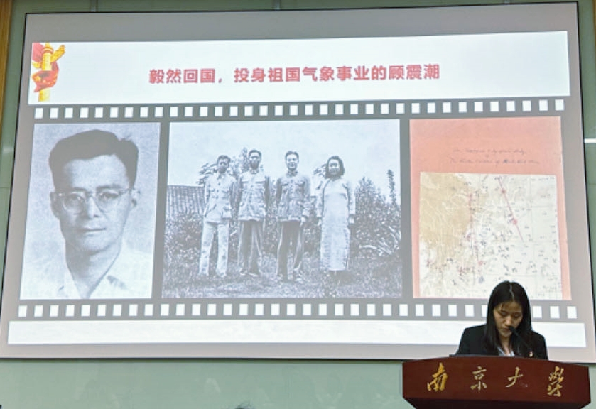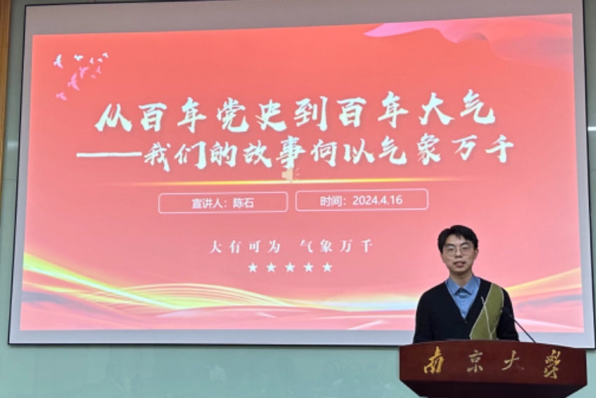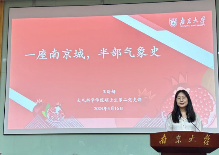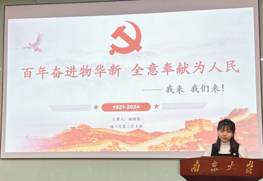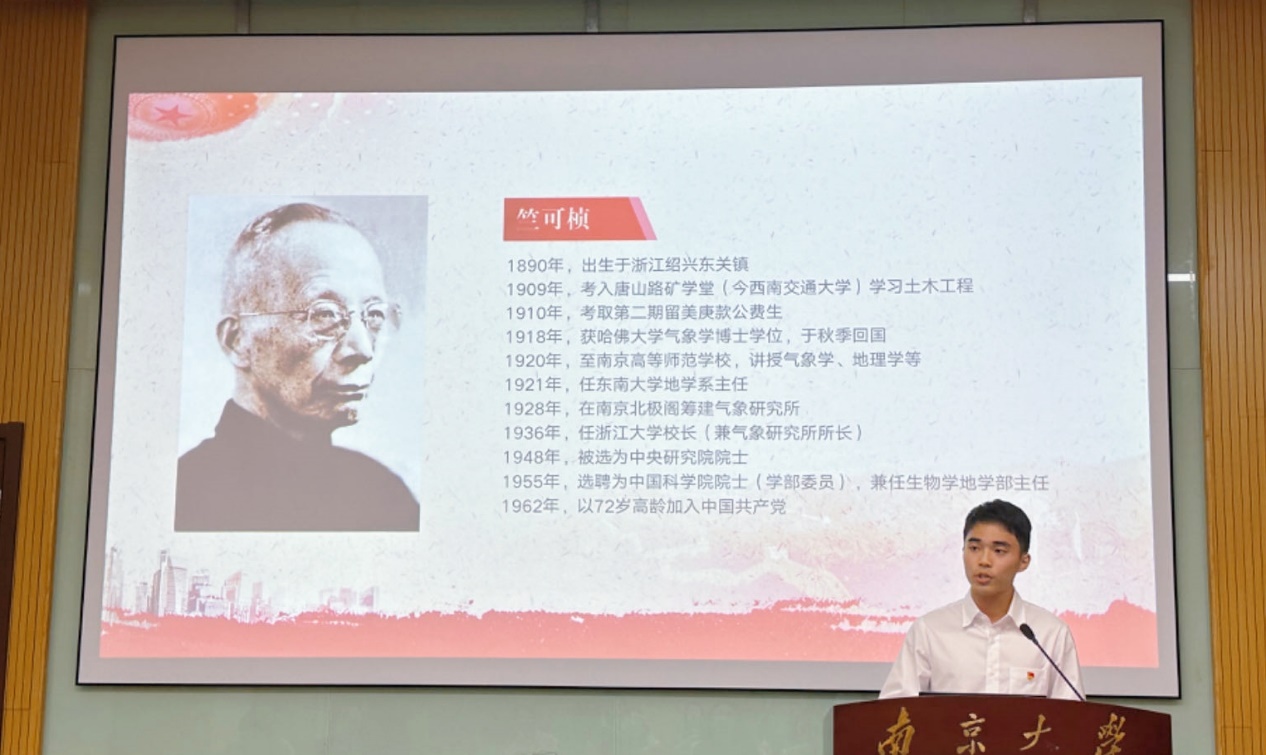 硕士生第二党支部的王昕妍同学带来微党课《一座南京城,半部气象史》,分享了竺可桢先生年逾古稀、成就等身之时仍坚定不移地选择加入中国共产党的故事,同时结合自身作为团务工作者的成长经历,明确且坚定了作为南大青年和少数民族员工应该肩负的历史责任和时代使命。