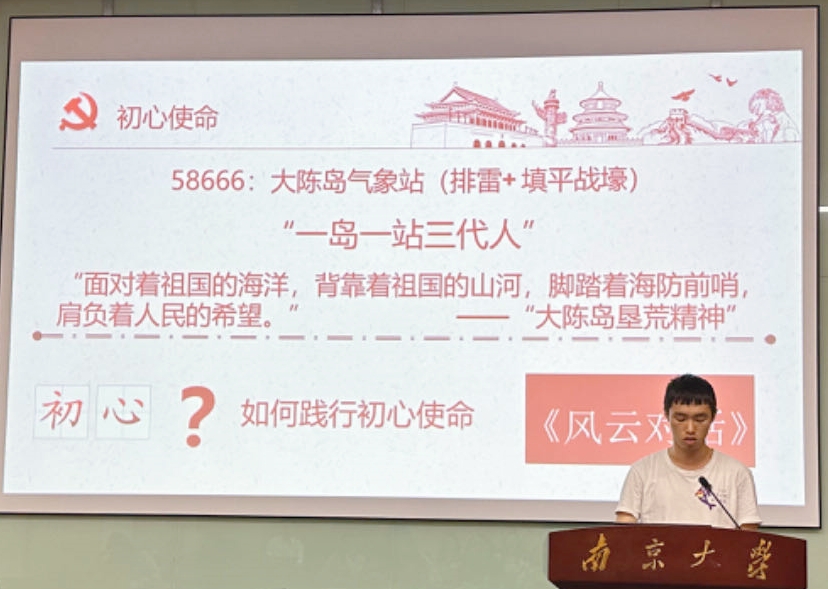 本科生党支部的周煜同学带来微党课《初心向阳,风雨兼程》,从一个气象站点号的故事开始追寻气象人、共产党员的初心使命,结合自身探访老教师和气象一线工作者的经历,讲述了南大大气人坚守岗位、勇为人先、无私奉献的故事。从“我是党员我先上”到“祖国需要即方向”,呼吁青年人坚守初心使命,不断前进,奋发向上。