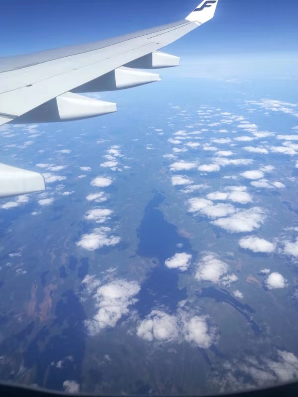 赫尔辛基时间下午一点,九个小时的飞行,我们终于飞入了芬兰的国境。不愧是“千湖之国”,从飞机上俯瞰芬兰大地,云块星罗棋布地排列在湖泊之上,而在云朵的隙间则点缀着形状各异的湖泊。根据张宁老师介绍,这是因为白天时湖泊上的大气边界层结较为稳定,不利于云的产生,无法产生大型云朵;而此时的陆地上空边界层结较不稳定,有利于云的形成。因此,从飞机上可以看到在湖泊上空没有云,而在陆地上空有云。