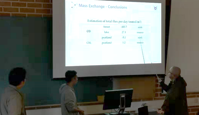 丰盛的午餐过后,同学们分小组讨论并总结了科考出发前的科研训练结果。12点45分,我们迎来了此次科考在芬兰的第一次汇报。科考团队共分为四个小组,每组分别选派了1-2名同学做了前期进展的简要汇报。马库·库马拉教授在现场为每个小组的工作做了点评与指导。库马拉教授对大家的许多工作都表示肯定,同时也提出了一些问题和建议,并询问了同学们下一步的研究计划。