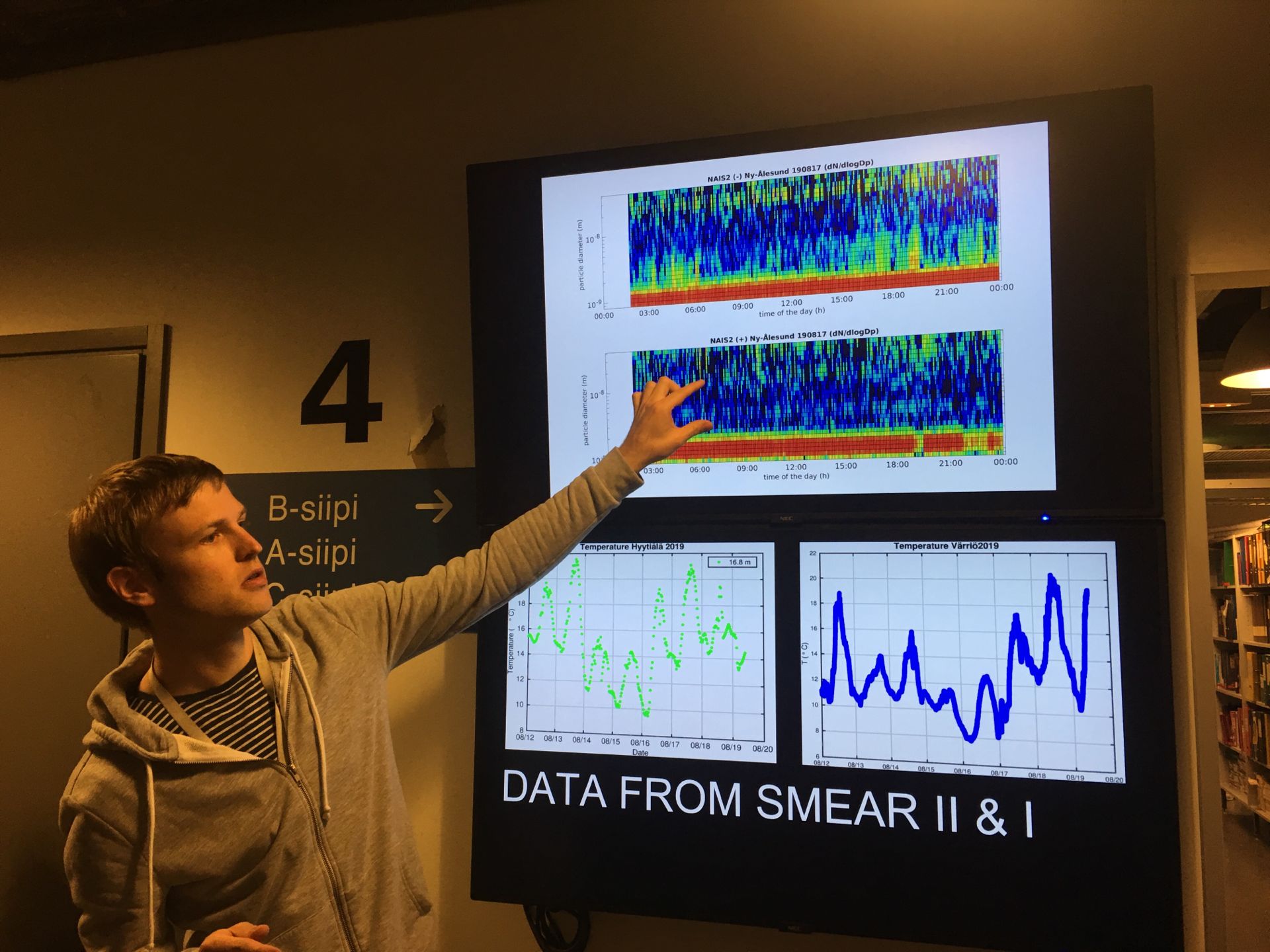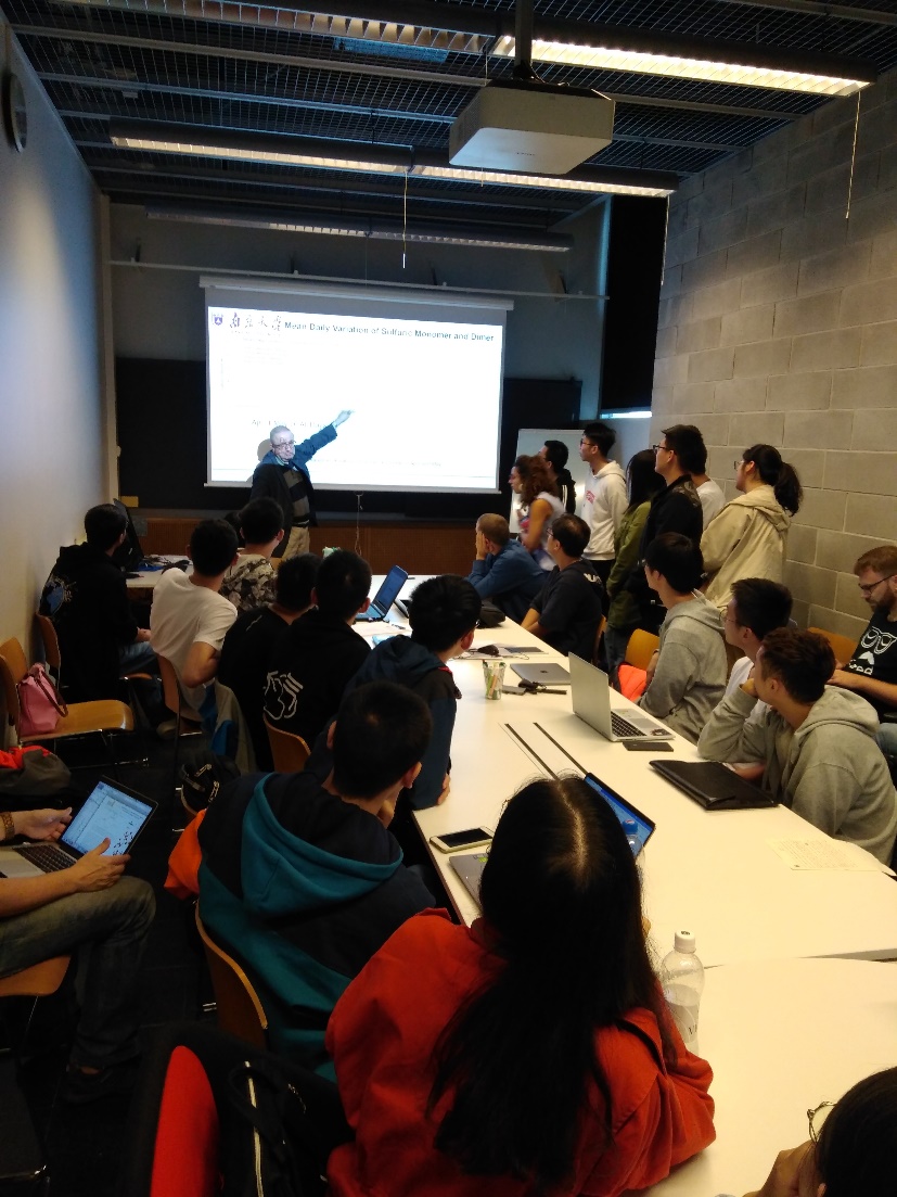 19日下午到达赫尔辛基大学Kumpala校区,Pekka Rantala博士先带领我们参观了和材料物理、气溶胶相关的多个实验室。之后Joni带领我们参观了SMEARⅢ站,一个坐落于校园内,地理位置处于城郊的小型铁塔观测站。由于地势较高,观测具有一定的代表性,所以铁塔并不高。接着,我们来到物理公司图书馆参观,馆内藏书浩瀚,书桌整齐排列,并备有电脑、打印机等设施,多间研讨室,很多人手中端着书认真地看着,十分静谧。下午4点钟,我们准时开始进行报告,这可谓是此行的重头戏,这次报告中将我们出发之前的工作和在芬兰小组工作的成果相结合,作为这一阶段的科考小结,意义非常。马库·库马拉院士也亲临现场,给与我们相应的指导。