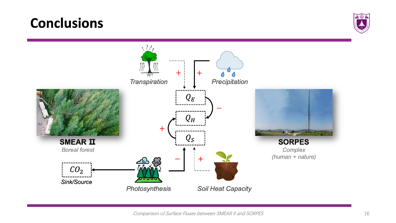 第二组是Surface Flux team(地表通量组),他们的研究课题是SMEAR II与SORPES地表通量特征对比。地表由向下短波辐射、反射短波辐射、向下长波辐射和向上长波辐射四个辐射分量获取净辐射。若不考虑人为热源,则净辐射以潜热通量、感热通量和储热通量的形式向大气与下垫面进行能量分配,影响局地及区域气候。CO2通量可用于衡量植被生长情况。他们尝试通过绘制年变化和日内变化图像、进行变量相关分析,获知两站地表通量的变化特征与差异,并探寻这些现象背后的原因。得到的主要结论是:SMEAR II表现为碳汇,且CO2通量相较SORPES而言具有更显著的年内变化; SMEAR II的土壤储热通量较小,SORPES的储热通量相对较大;SMEAR II的潜热通量总体弱于SORPES。相较于植被蒸腾,降水对潜热通量有更显著的促进作用,在受季风气候控制的SORPES作用明显,抑制了能量向感热分配;直接观测数据表明,SMEAR II的净辐射总体弱于SORPES,而SMEAR II的感热通量总体比SORPES更大且年变化更显著,这一特征尚不能被直观解释。可将感热通量作为净辐射在扣除潜热通量和储热通量后的余项而得到间接解释。小组的未来计划是研究潜热通量对净辐射之比与气温之间的对数关系是否具有实在的物理基础;探寻光合作用与储热通量之间的关系;采用高频微气象数据分析两站的湍流特征及其差异。