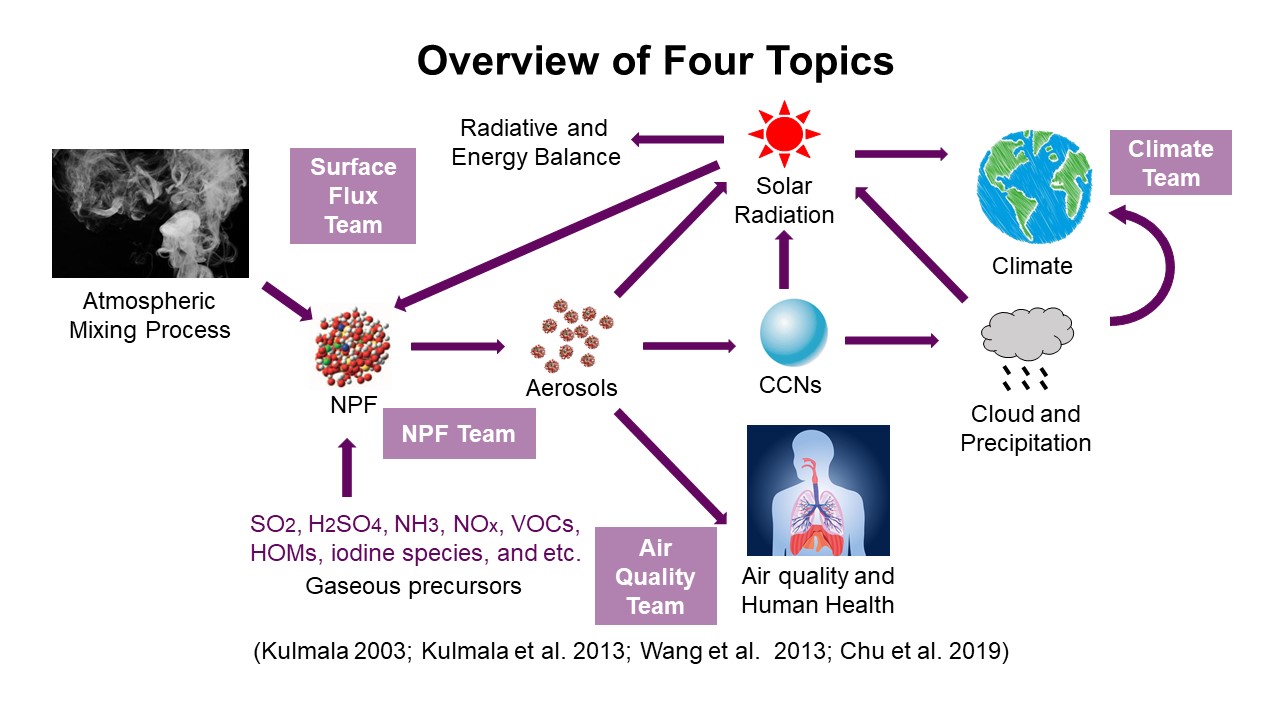 第一组是NPF team(New Particle Formation team,新粒子生成小组)。他们的主要任务是围绕新粒子生成及增长的两个过程,探究南京的SORPES站和Hyytiälä的SMEARⅡ站在两种截然不同的环境下,各种气态前体物在两个过程中起到的作用。他们得到的主要结论是:在春季,南京的成核过程当中,硫酸是主要的贡献因子;在Hyytiälä,硫酸和高氧化分子都对新粒子成核起到了重要作用。在他们的研究计划当中,将进一步找出高氧化分子最相关质量区间内的特定物质,探讨其浓度或化学性质与新粒子生成事件之间的关系以及温度、硫酸稳定剂等因素对新粒子生成和增长的影响。