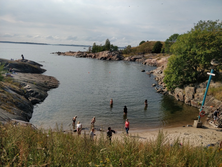继续向前走,在地势高的地方,可以看到美丽的波罗的海,海湾里有穿着泳衣嬉闹的游人,岩石上有随意躺卧沐浴阳光的游人。