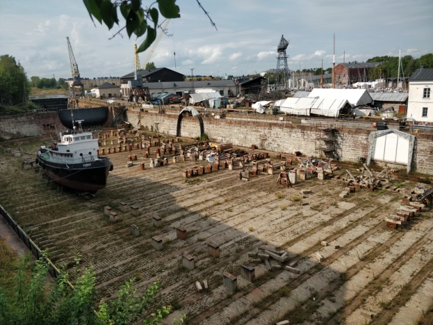 沿着地图上指示的蓝色路线,可以到达芬兰堡最著名的主要景点。芬兰城堡教堂相比于红白教堂,建筑简单大气,教堂塔尖行有一座运行至今的灯塔,同时为空中和海上航行提供指引。再往前走,便到了大庭院,大庭院曾经作为主广场使用,在克里米亚战争期间被严重摧毁。现在的大庭院中间,可以看到奥古斯丁·厄伦斯瓦德的纪念碑。大庭院以北是欧洲最古老的干船坞之一,以南则是厄伦斯瓦德的故居,现在是厄伦斯瓦德博物馆。