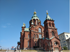 与白教堂遥而相望的,是赫尔辛基的另一座著名教堂,Uspenski Cathdral,圣母安息主教堂。与白教堂不同的是,这座东正教教堂坐落在Katajanokka半岛入口的一座小山上面,整座建筑物通体由红砖石筑成,庄严肃穆,古典高雅,因此又被称为红教堂。她有着13个镀金的塔尖,象征着耶稣与他的十二个门徒,在夏天灿烂的阳光下,塔尖闪闪发光,仿佛在讲述着一个个神圣的故事。