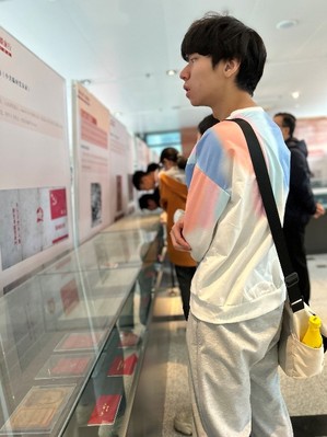 进入图书馆大厅后,首先映入眼帘的是展览第一部分:入党志愿书制度的百年历程。该部分展示了在不同历史阶段的入党申请书、入党介绍表、党员登记表、党员档案等,展现了入党志愿书制度的百年演变历程。展板前,同学们三两成行驻足观摩。在大厅长廊参观完后,大家沿着路牌指示来到了核心展区。一幅幅图片,一件件实物、一个个故事,生动再现了中国共产党在探索中前行的光辉印记。大家看到,一百多年来,中国共产党守正创新、砥砺奋进,逐步建立了严格、严谨、严密的入党制度体系,为党以伟大自我革命引领伟大社会革命提供制度保障。