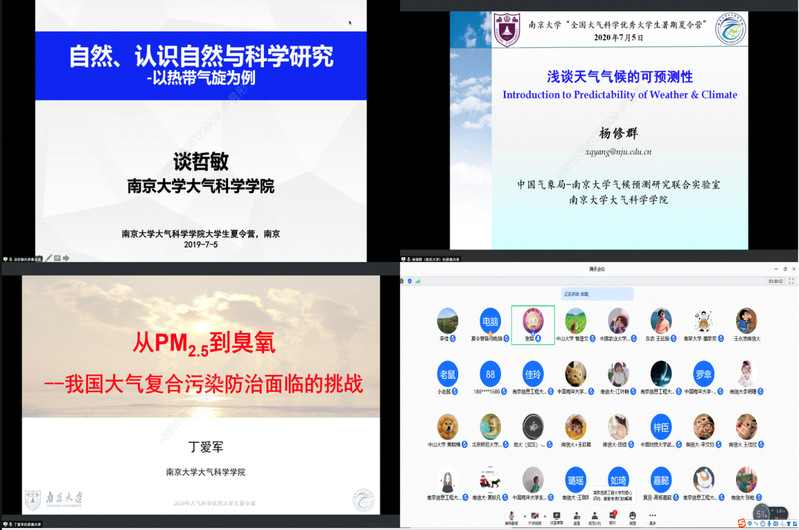 下午,公司为营员们安排了三场精彩的学术报告,分别由谈哲敏教授、杨修群教授、丁爱军教授主讲。谈哲敏教授以台风研究为切入点介绍了科学家认识自然、理解自然的科学思维和方法;杨修群教授介绍了在天气和气候预测科学发展历程中一个重要的科学问题——可预报性问题;丁爱军教授结合政府和百姓关心的大气污染问题,介绍了我国大气污染防治面临的挑战。三位教授的学术报告深入浅出,营员们在报告后提出了许多高质量的学术问题,隔着屏幕也能感受到大家的求知热情。