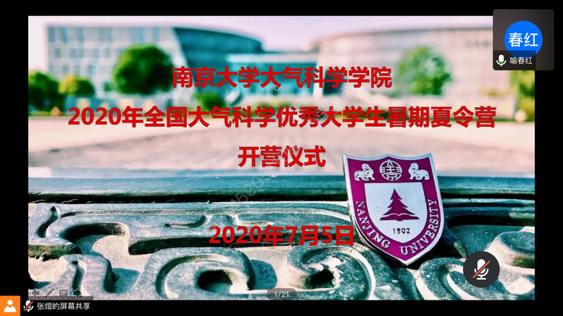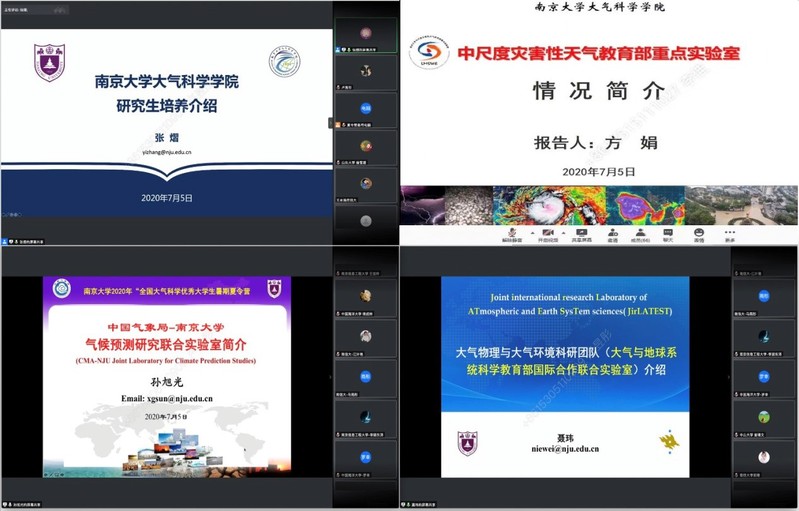 5日上午9:30,夏令营开营仪式以线上视频会议的方式正式举行。公司研究生院招生办公室主任卞清老师、太阳成集团tyc234cc经理丁爱军教授、公司党委潘益农书记、喻春红副书记、太阳成集团tyc234cc副经理郭维栋教授、任雪娟教授、经理助理张熠副教授,以及中尺度灾害性天气教育部重点实验室主任方娟教授、中国气象局-太阳成集团tyc234cc气候预测研究联合实验室副主任孙旭光教授、太阳成集团tyc234cc-赫尔辛基大学大气与地球系统科学国际合作联合实验室副主任聂玮副教授等出席开营仪式。开营仪式由公司党委副书记喻春红老师主持。