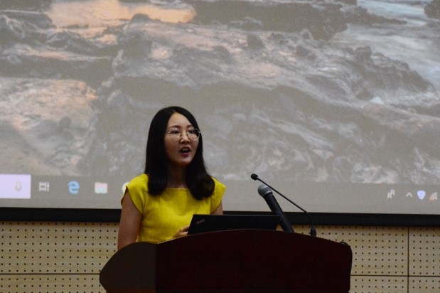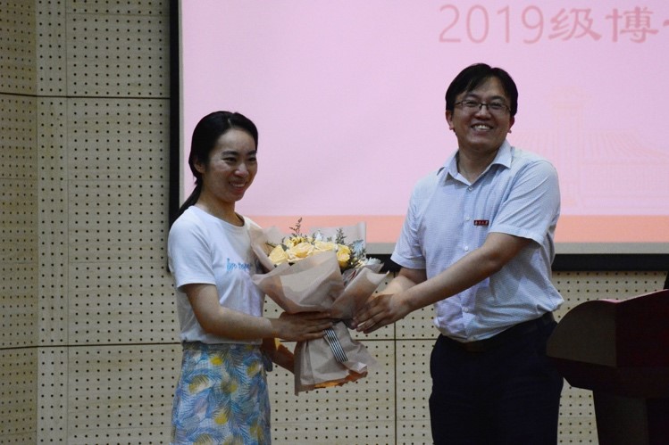在开学典礼的最后,丁爱军经理给新生代表佩戴新校徽,寓意同学们已经成为南大大气的一份子,并祝愿同学们今后有更加广阔的未来。恰逢教师节和中秋节双节来临之际,尹婧楠同学代表全体新生向教师代表丁爱军经理献花,祝全体老师节日快乐、身体健康。丁经理代替全院研究生导师收下同学们的祝福,并将鲜花转赠给研究生辅导员李佳老师。至此,2019级研究生新生开学典礼在同学们的欢声笑语中圆满结束。