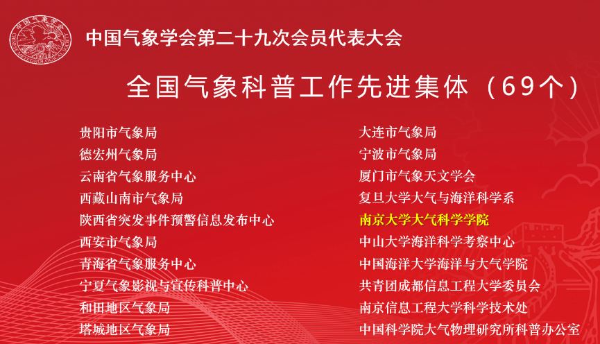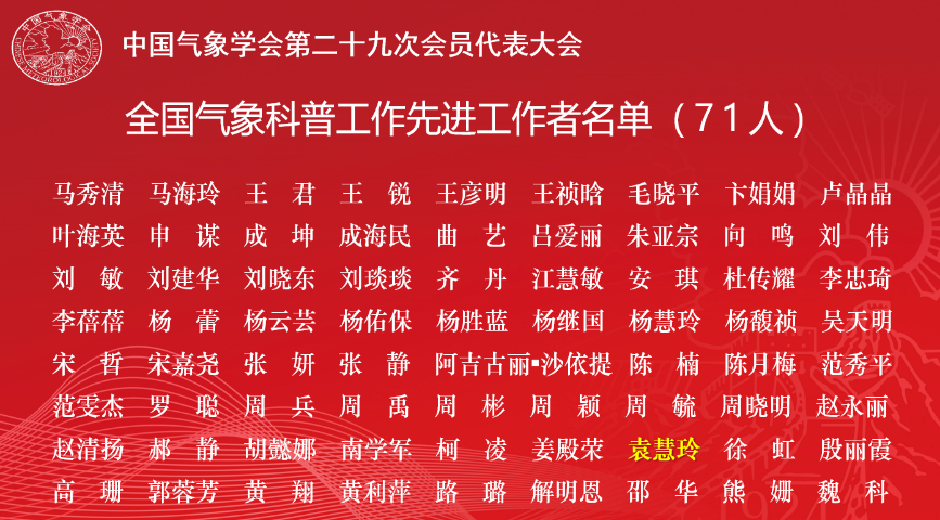 大会审议通过了第二十八届理事会工作报告、《中国气象学会章程》修订草案,对全国气象科普先进集体和先进工作者等进行了表彰。太阳成集团tyc234cc荣获全国气象科普工作先进集体,袁慧玲教授荣获全国气象科普工作先进工作者。