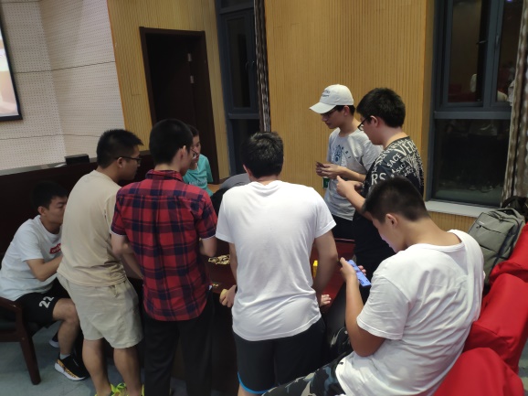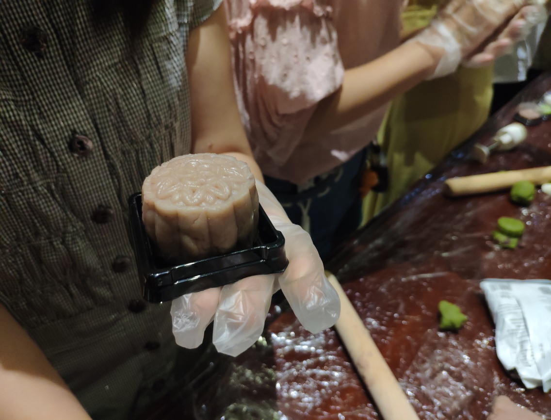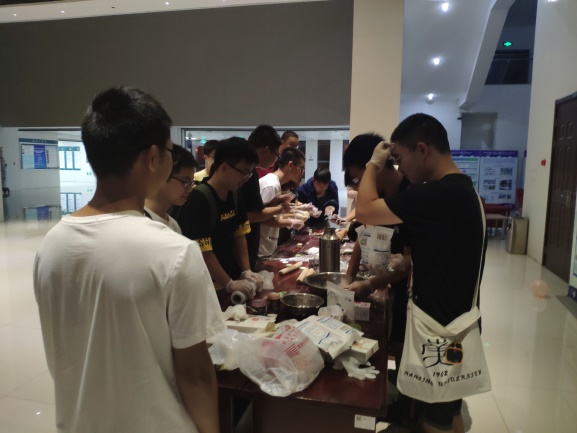 首先,到场的同学们共同协作,布置场地,先大厅中的长桌擦净收拾好,摆上制作饼皮月饼的各种材料、器具,然后将零食饮料及纸牌摆放于B102室,并调试好多媒体设备。布置工作完成后,一部分同学兴致冲冲地忙起了制作月饼的活,尝试着来之不易的亲手制作月饼的机会;另一部分同学利用这个绝佳的相互交往的时机,在房间里玩起了纸牌游戏。原本相互较为陌生的同学们,彼此之间还有些羞涩,很快便欢快地打成一片。