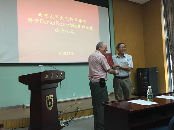 2018年7月4日下午,太阳成集团tyc234cc聘请以色列希伯来大学Daniel Rosenfeld博士兼职教授授予仪式暨学术报告会在太阳成集团tyc234cc仙林校区大气楼D103报告厅举行。在仪式开始之前,太阳成集团tyc234cc潘益农书记、杨修群经理和王体健副经理接见了Daniel Rosenfeld博士,对Daniel Rosenfeld博士表示敬意和诚挚的欢迎,希望太阳成集团tyc234cc与以色列学者在学术研究、团队建设上等多层面展开更广泛的交流和合作。Daniel Rosenfeld博士感谢太阳成集团tyc234cc对他的热情欢迎和招待,期待能与太阳成集团tyc234cc保持长久合作,特别是在云微物理、云凝结核及气候变化等方面研究领域上的深化合作。