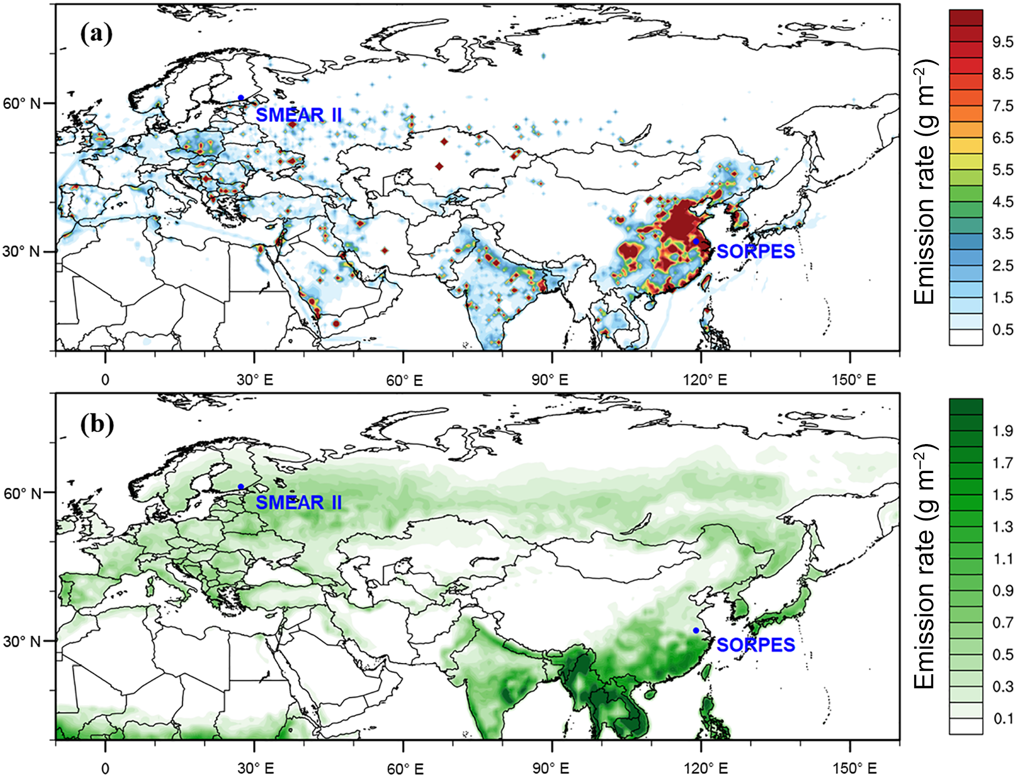 图1 SORPES和SMEAR II站点位置(a为年均人为SO2排放,b为年均自然源单萜排放)