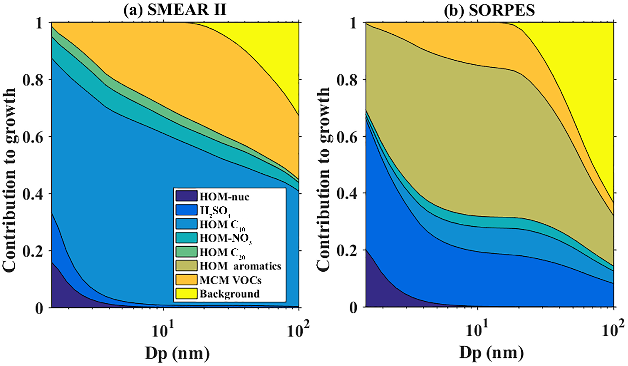 图2 (a)SMEAR II站和(b)SORPES站各类气态组分对于纳米气溶胶增长的贡献。