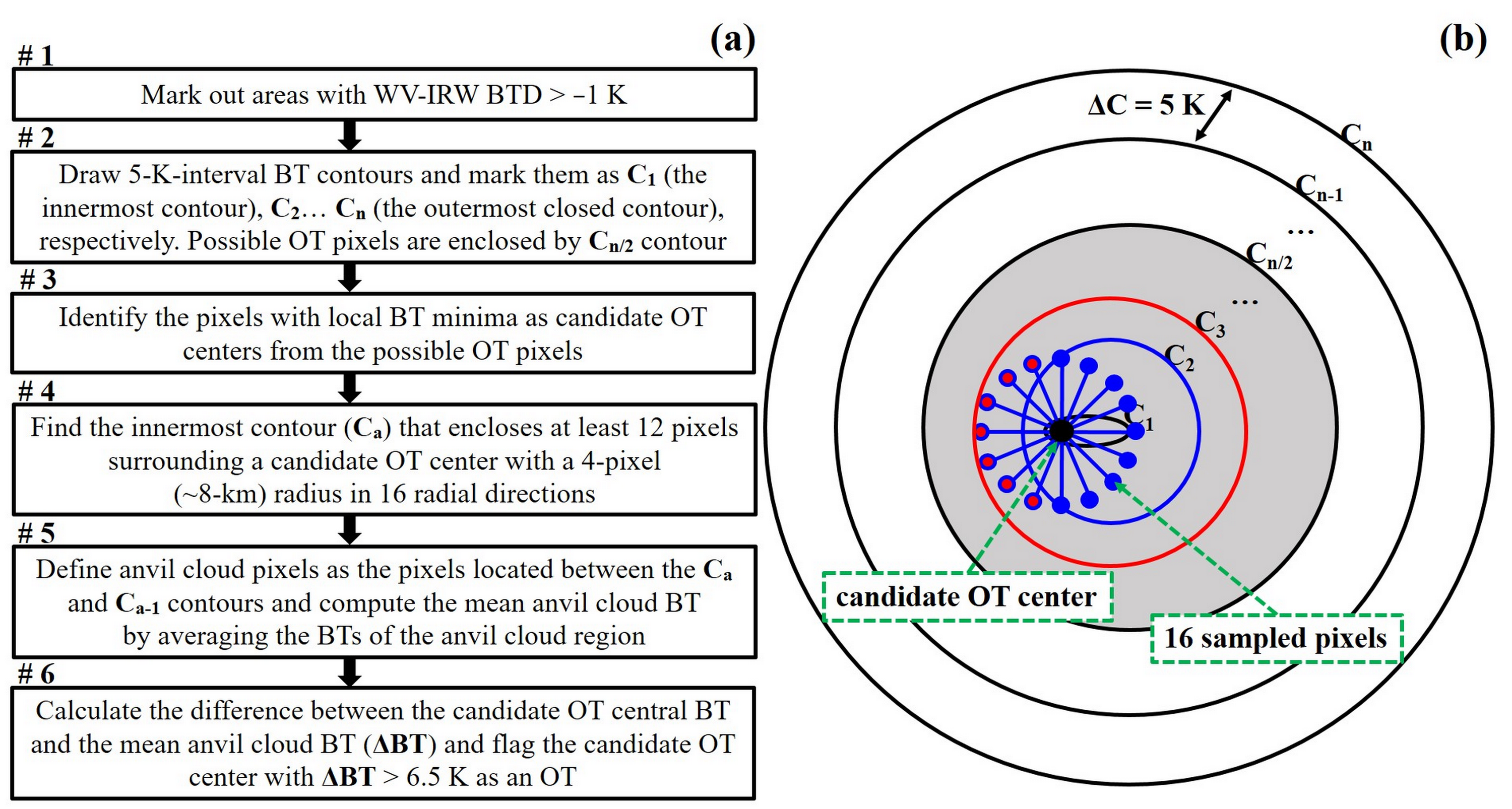 图 1. 穿透性对流自动识别算法的流程图和示意图。