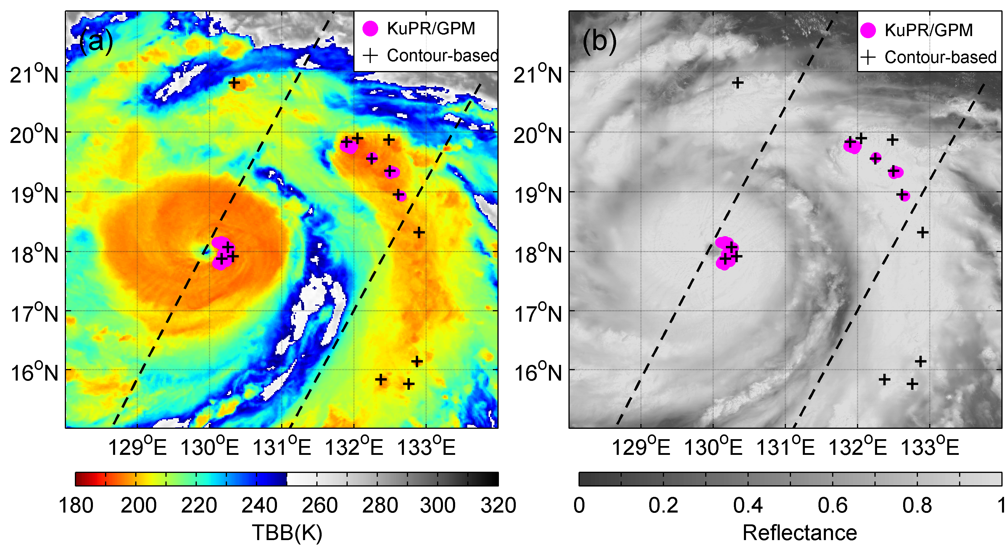图 2.葵花8号的红外图像(a)和可见光图像(b)。洋红色实心圈代表KuPR/GPM观测的穿透性对流,黑色加号代表新算法的识别结果,黑色虚线表示KuPR/GPM扫描带宽的边界。