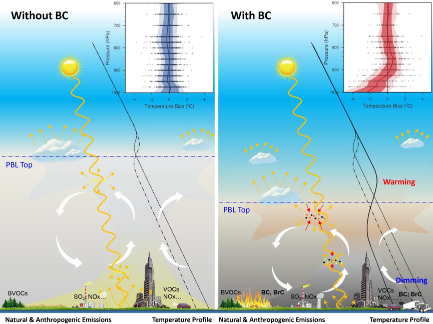 图1 黑碳影响气溶胶-大气边界层相互作用的概念模型及气候态“观测”证据:左右图的右上角分别为北京2010-2016年污染较轻(最低25%)和重污染(最高25%)期间气象探空和再分析资料的气温廓线差异 (该图结合Ding et al. 2016所建立的概念模型和Huang et al. 2018的诊断结果重新绘制)
