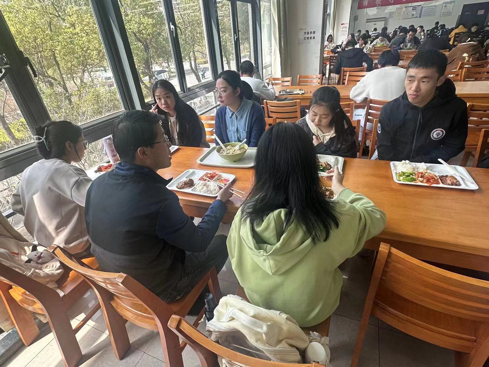 一方餐桌,是缱绻岁月的晴雨表,忙碌生活的加油站。相较办公室中稍显拘谨的交流氛围,餐桌上的对话更显自然活跃。同学们踊跃发言,畅抒己见。几位老师耐心倾听同学们的心声,鼓励同学们勇敢面对挑战,积极追寻梦想。对于同学们提出的学术疑难、生活困扰,以及对教学改革的意见和建议,老师们也给出了详细贴心的回应。来自同一宿舍的同学在日常生活中本就有着频繁的互动与交流,几位老师借此良机鼓励宿舍成员彼此之间相互学习、相互激励、相互帮扶,共同营造温暖和谐的寝室文化氛围。