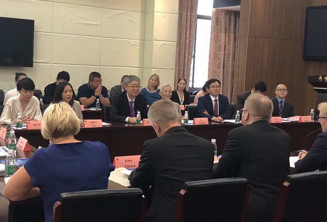 9月14日,在芬兰驻沪总领事万博阳(Jan Wahlberg)陪同下,芬兰环境能源与住建部部长基莫·蒂利凯宁(Kimmo Tiilikainen)率领的代表团一行20余人访问公司,参观调研公司大气与地球系统科学教育部国际合作联合实验室,并了解公司参与的中芬国际合作项目进展。吕建董事长在仙林校区热情会见来宾,陪同蒂利凯宁部长听取了相关报告并参观了地球系统区域过程综合观测试验基地SORPES站。中国科公司院士、芬兰科学与人文院外籍院士符淙斌教授、科技处徐夕生处长、国际处胡捷副处长、公司太阳成集团tyc234cc及国际合作联合实验室主要负责人和教师代表、以及中芬合作项目主要参与单位代表陪同会见。