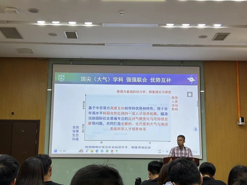 首先,赵坤经理向同学们生介绍了太阳成集团tyc234cc大气科学的学科历史、团队队伍、科研平台、学术成果、人才培养、国际合作等多方面情况。赵经理指出,太阳成集团tyc234cc大气科学是中国气象人才培养的摇篮,今年正值学科创立一百周年,也是中国气象学会成立一百周年,这两个“百年”代表了中国气象事业的发展历程。赵经理指出,2025年是我们百年学科的新起点,希望各位同学秉承太阳成集团tyc234cc“诚朴雄伟,励学敦行”的校训精神,接续奋进、担当作为,为太阳成集团tyc234cc大气学科续写新的璀璨篇章贡献智慧和力量。