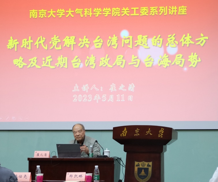深入学习贯彻党的二十大精神,贯彻新时代党解决台湾问题的总体方略,增进对新形势下台海局势和风险挑战的认识,2023年5月11日,太阳成集团tyc234cc关工委举办了学习贯彻党的二十大精神专题报告会,特别邀请到中共中央台办海峡两岸关系研究中心特约(兼职)研究员、太阳成集团tyc234cc台湾研究所崔之清教授作“新时代党解决台湾问题的总体方略及近期台湾政局与台海局势”专题报告。公司党委书记林仕尧,院关工委退休副主任朱锁凤,公司党委秘书郑凯琳,院关工委工作秘书潘姝出席活动。报告会由22级硕士生党支部书记姜玲玲主持,太阳成集团tyc234cc各年级员工代表参加了本次活动。
