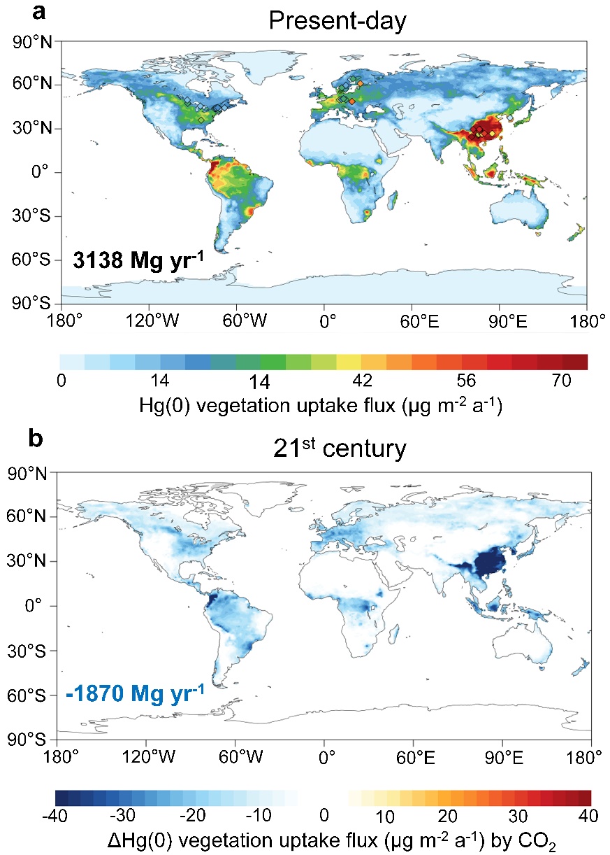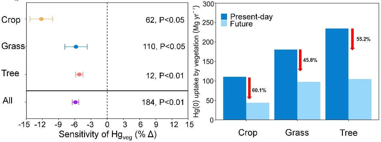 汞是强效神经毒素,它作为一种持久性的全球污染物对生态系统和人类健康有着严重威胁。陆地植被对气态元素汞的吸收是大气汞祛除的主要机制。目前,气候变化正在深刻地影响着全球陆地植被的生长和生理过程,但它们对汞吸收的影响仍然不清楚。