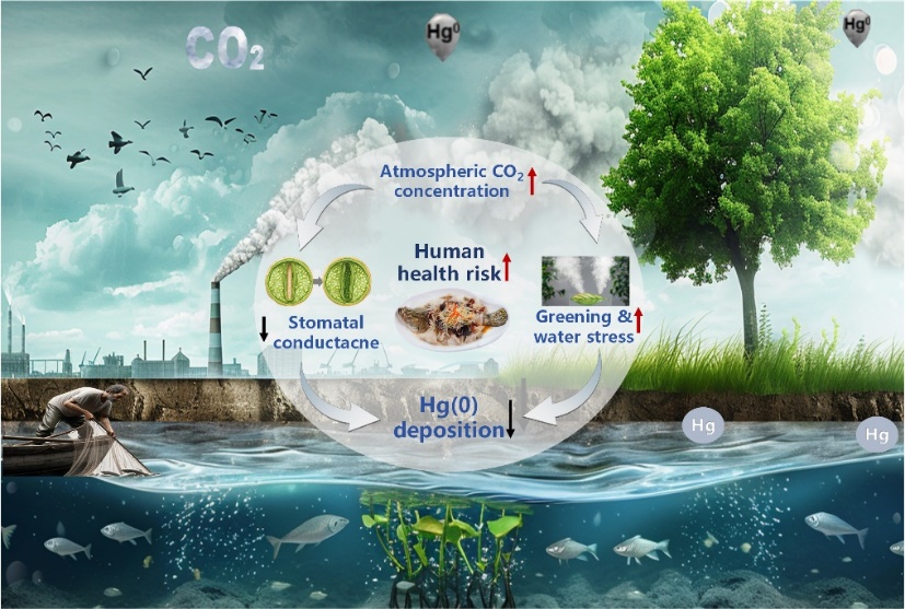 研究发现相较于其他气候变化因子,CO2的生物地球化学效应是调控未来全球植被吸收大气汞的主导因素。大气CO2浓度每升高100ppm,植物叶片内的汞浓度下降约5.87%,且不同植被功能类型对其响应的敏感性存在差异,其中作物类型最为敏感。而该现象的背后是陆地生态系统复杂的汞&碳和水相互作用的机理。CO2浓度升高的生物地球化学效应导致了植物的光合作用增强同时伴随水分的丧失,对此,植物选择降低气孔导度来减少蒸散发的消耗,导致了气孔导度的下降,进而改变了植物叶片对汞的吸收速率。