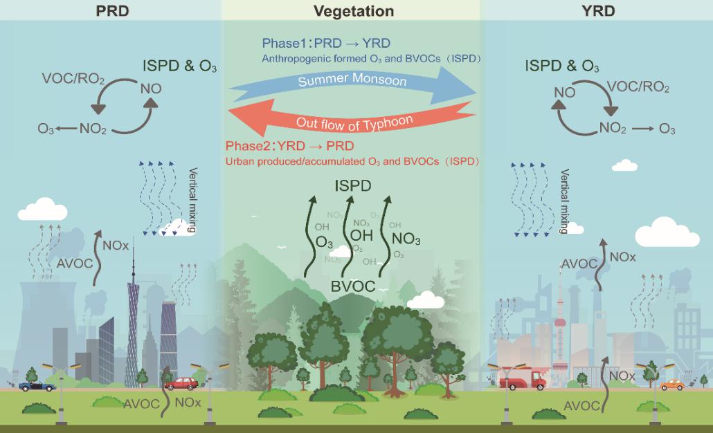 该研究分析了多年台风路径和臭氧观测数据,发现当台风路径经由西太平洋低纬地区北上跨越台湾海峡时会导致长三角和珠三角先后出现区域性臭氧污染。结合气象-自然源-化学耦合模拟,研究发现:台风外围高温和强辐射等条件显著加剧了华南森林挥发性有机物(BVOC)的排放,可通过与人为源的相互作用增强两大城市群区的臭氧污染;而随着台风的逼近和登陆,两大城市群间的臭氧及其前体物存在显著的上下游输送关系。