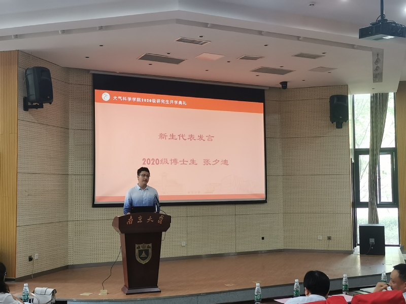随后,2020级博士生张夕迪同学代表全体新生发言,表达了成为一名南大研究生的喜悦之情。他表示在人生中我们都要面临很多选择,这些大大小小的选择会串联成线,构成我们最宝贵的南大时光。作为一名南大学子,我们应该少一些盲从,多一些探索;少一些安逸,多一些拼搏;少一些推脱,多一些担当。面对困难与挫折,要坚持拼搏,心无旁骛追求卓越,为国家大气科学的发展贡献自己的一份力量。发言最后,张夕迪同学代表全体研究生新生祝全体老师节日快乐、身体健康、家庭和睦、万事如意。