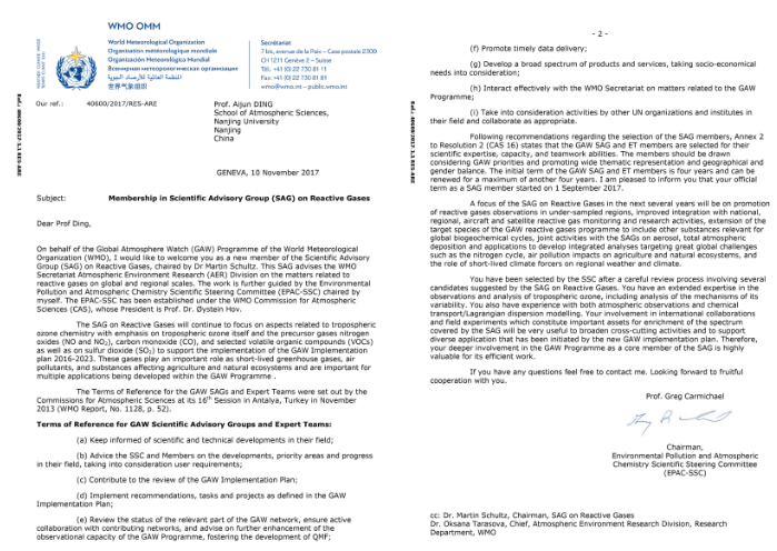 日前世界气象组织WMO大气环境研究部主任Oksana Tarasova博士发来由WMO环境污染和大气化学科学指导委员会EPAC-SSC主席G. Carmichal教授签署的聘任信,聘请丁爱军教授担任全球大气观测GAW计划反应性气体工作组科学顾问组(Scientific Advisory Group- SAG)成员。