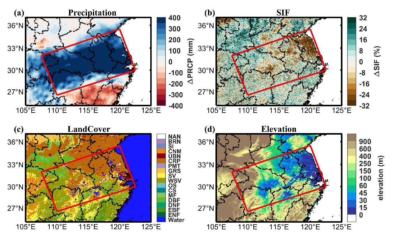 图(a), (b)分别为2020年6-7月中国东部降水异常以及日光诱导叶绿素荧光异常的空间分布,图(c), (d)分别为研究区域的土地覆盖类型与海拔高度分布。