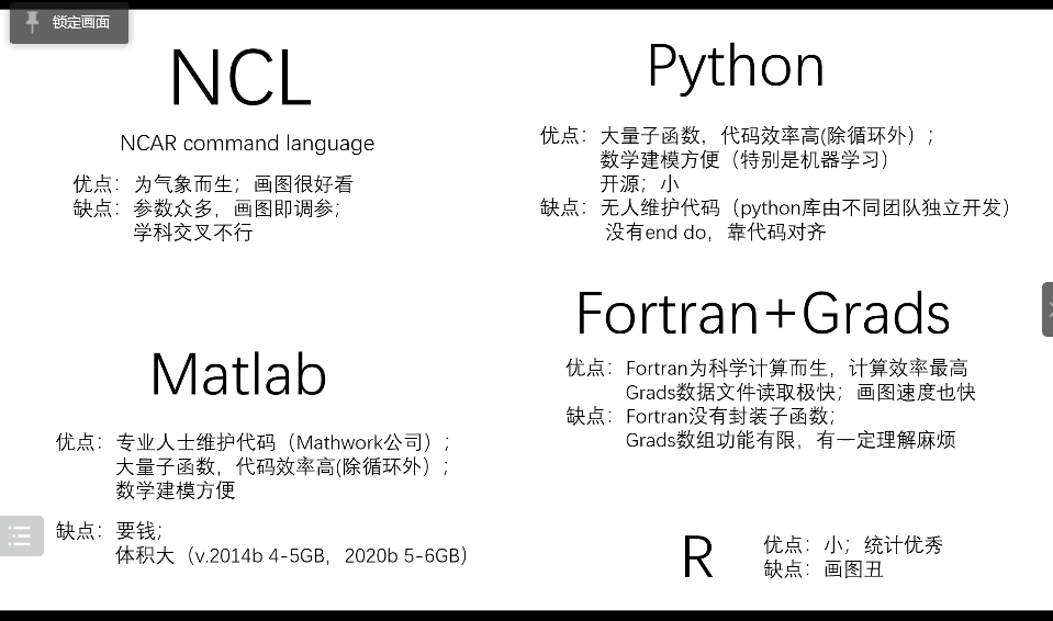 首先,聂俊同学介绍了NCL的适用领域(适用于气候学、天气学),并且对比了NCL、Python、Matlab、FORTRAN+GRADS、R等语言的优缺点。他指出,NCL作为一门为气象而生的语言,具有作图美观等优点的同时,也存在参数众多,学科交叉欠佳方面的问题,大家需要根据自己的研究方向与需求选择合适的工具。