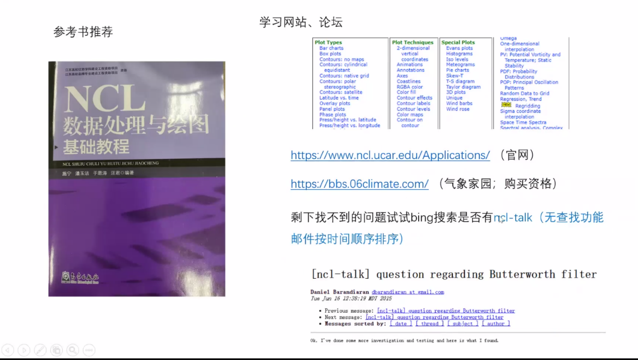 在正式开始学习之前,聂俊为大家推荐了一系列参考书目及学习网站,帮助同学们更好地掌握NCL;并且,考虑到各位同学电脑系统类型的差异,他推荐了不同的安装路径。