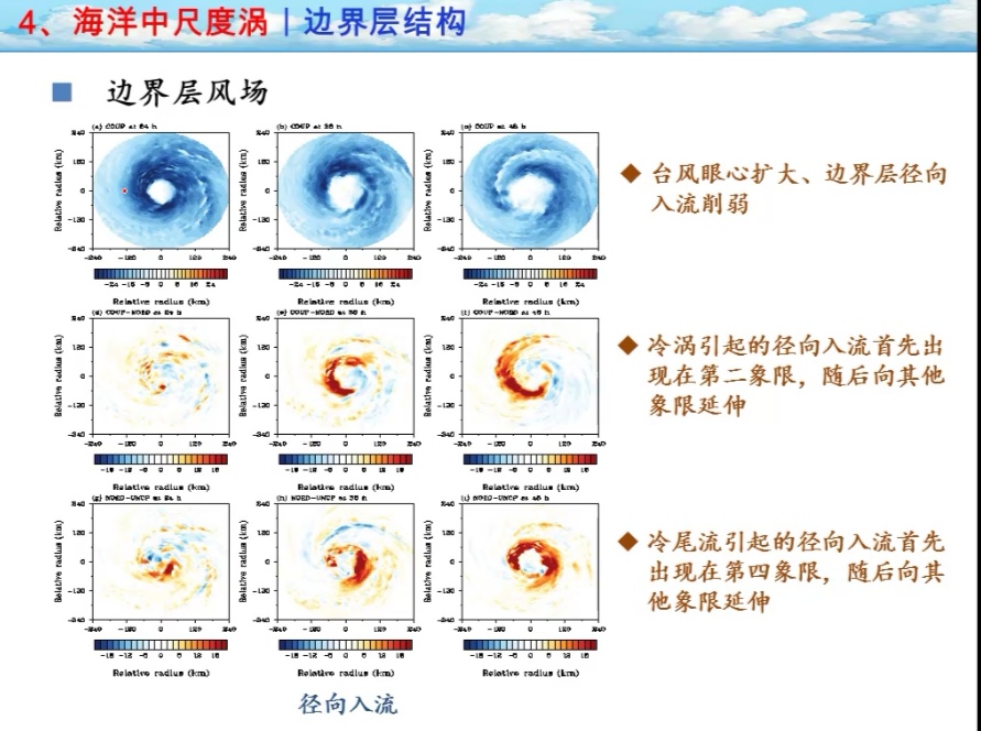 接下来,马老师分析了有关于海洋冷暖涡对台风边界层的影响对比,以及它们与台风冷尾流的影响的区别。结果发现,冷涡和冷尾流的作用相似,都是增加大气稳定度,从而抑制了台风中相应区域的降水。总体来看,冷涡对台风边界层的影响程度要比暖涡大得多,这是由于冷涡中混合层的厚度很低,冷水上翻引起的冷尾流更强所导致。有关于冷涡上方的台风边界层入流速度矢量更加偏向于台风中心的问题,马老师认为这个现象是冷涡处大气边界层中气压梯度力更小导致的,而不是其他研究中所指出的,湍流强度减弱导致的摩擦降低所导致的。