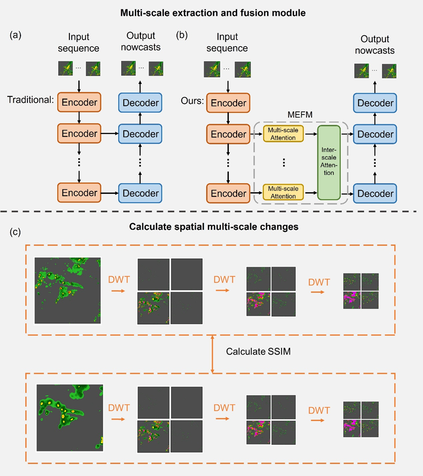 图1.多尺度深度学习框架示意图。(a) 用于短临预报的传统层级式编码器-解码器模型结构。(b)添加了多尺度注意力模块的模型结构。(c) 使用离散小波变换(DWT)分解和计算不同尺度的损失函数。