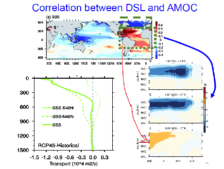 王桂华教授首先介绍了海洋环流的基本特征以及海洋环流对全球变暖响应的国内外研究进展,指出全球变暖条件下海洋环流次表层及西边界有显著的变化特征。接着王桂华教授分析了副热带海洋环流变化的独特特征,并利用海洋环流模拟试验和简单理论探讨了海洋表面强迫项SST、SSS和风在黑潮和湾流变化中的作用。王桂华教授指出,黑潮上层环流增强,而下层环流减弱,湾流上下层都在减弱, 两支西边界流不一致是因为前者和海表温度变化显著相关,后者则与盐度变化显著相关。随后王桂华教授分析了高纬度环流的变化特征,指出目前模式在ACC模拟方面存在较大的不确定性,而这主要是由40N以北的盐度不确定性有关。